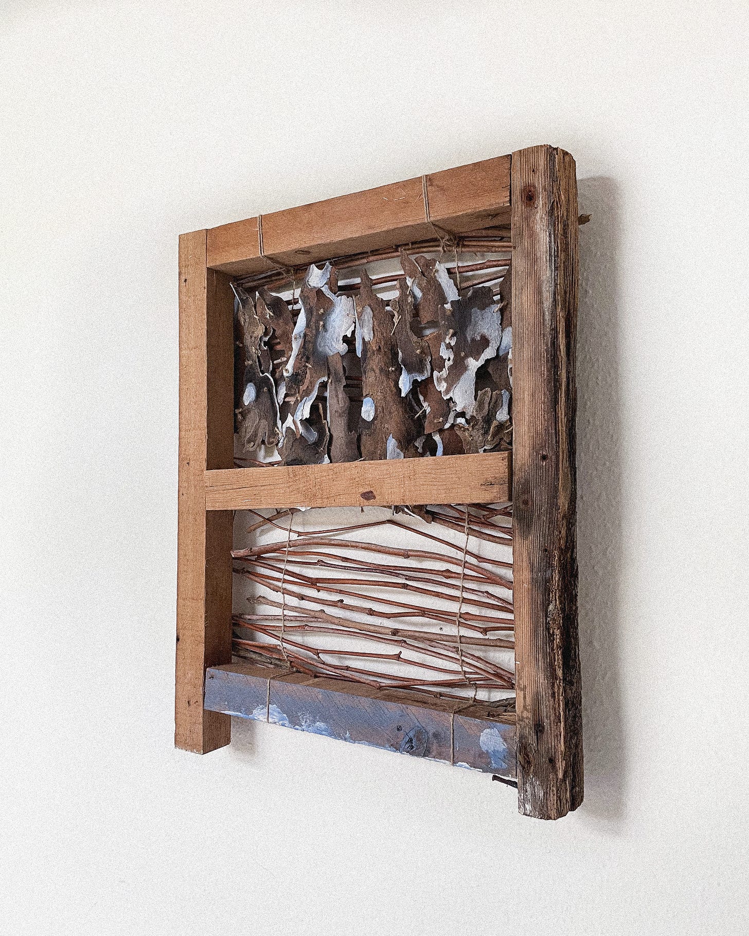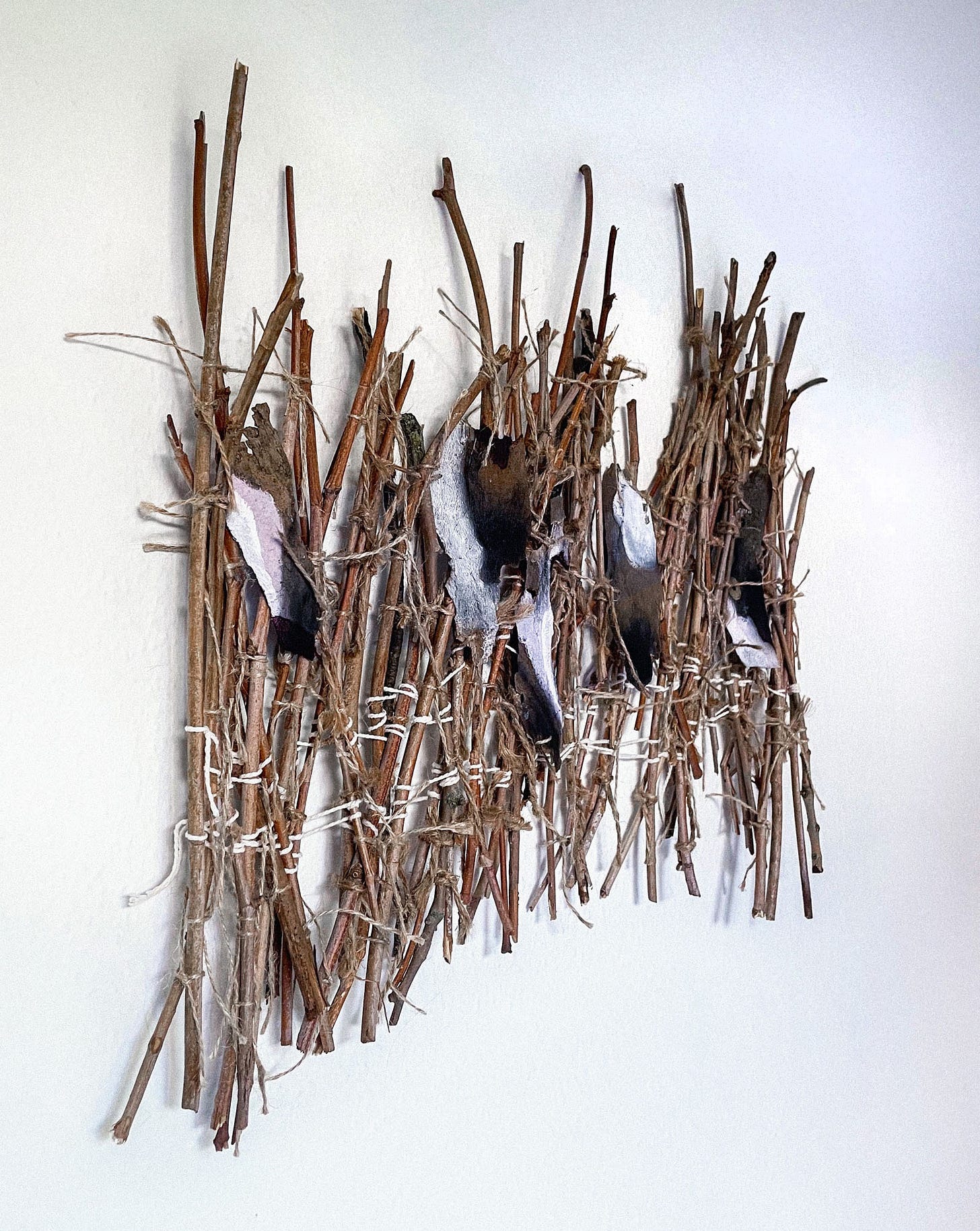 There are two levels to this, but in the details of these works, there are painted sections that layer over and mimic the textures of the surfaces they’re on. Charcoal and oil paint are used to highlight or visually quiet down sections of the pre-existing patterns in the bark, but also in the stripes on the twigs, and blackened sections of wood. Rather than paving over the top of any areas entirely, even the most affected areas are allowed to shine through, making it difficult, at a glance, to discern what’s “natural” or not. It’s a kind of dialogue and negotiation that mirrors the daily choices of queer and vulnerable people in how they present themselves in spaces, but also in animal prey, in unsafe environments, in the presence of predators. I think the works move within a noticeable spectrum of visibility with different amounts of conformity to the traditions of painting, with Passing and Through being somewhere in the middle and Hybrid Fields more diverging.
