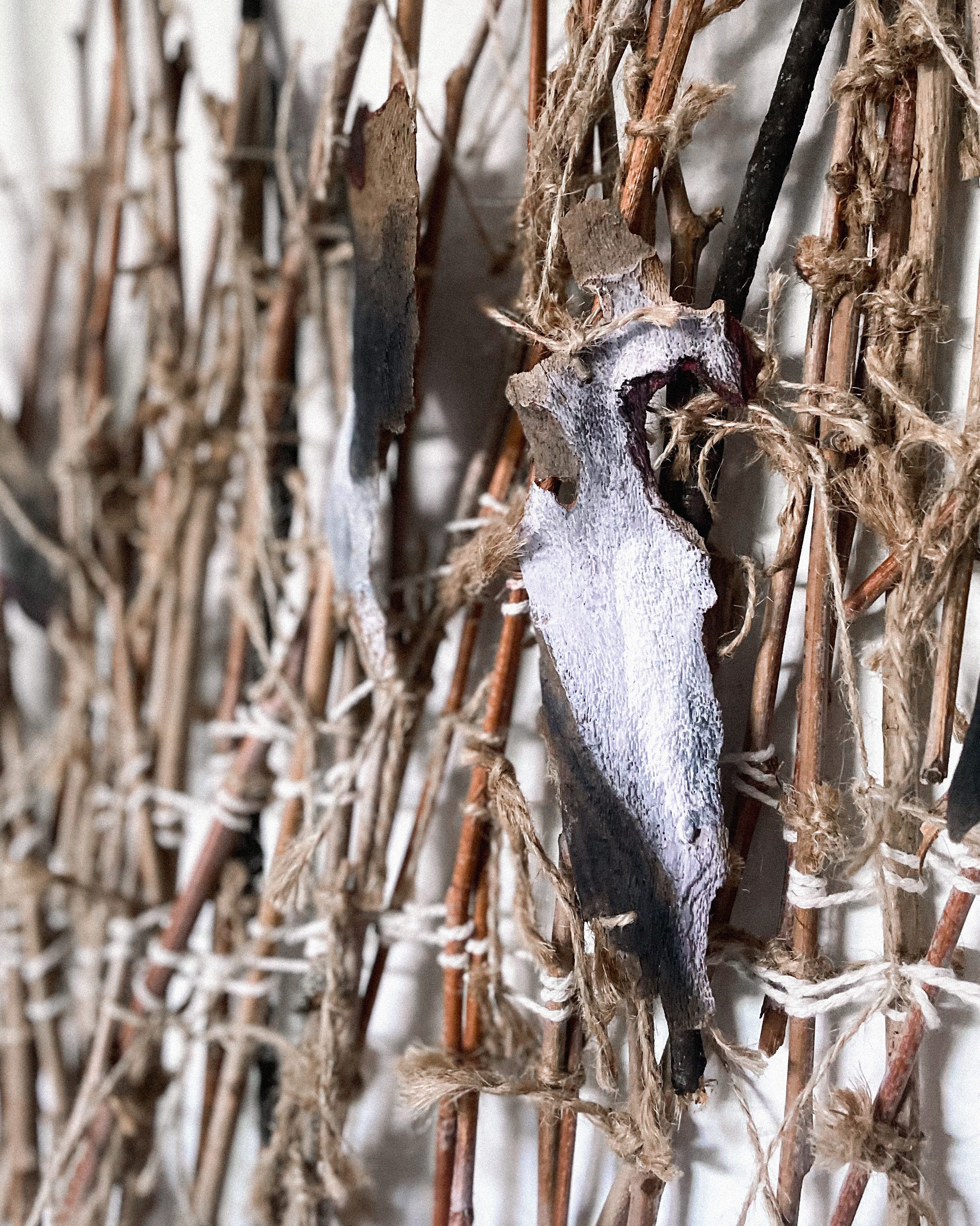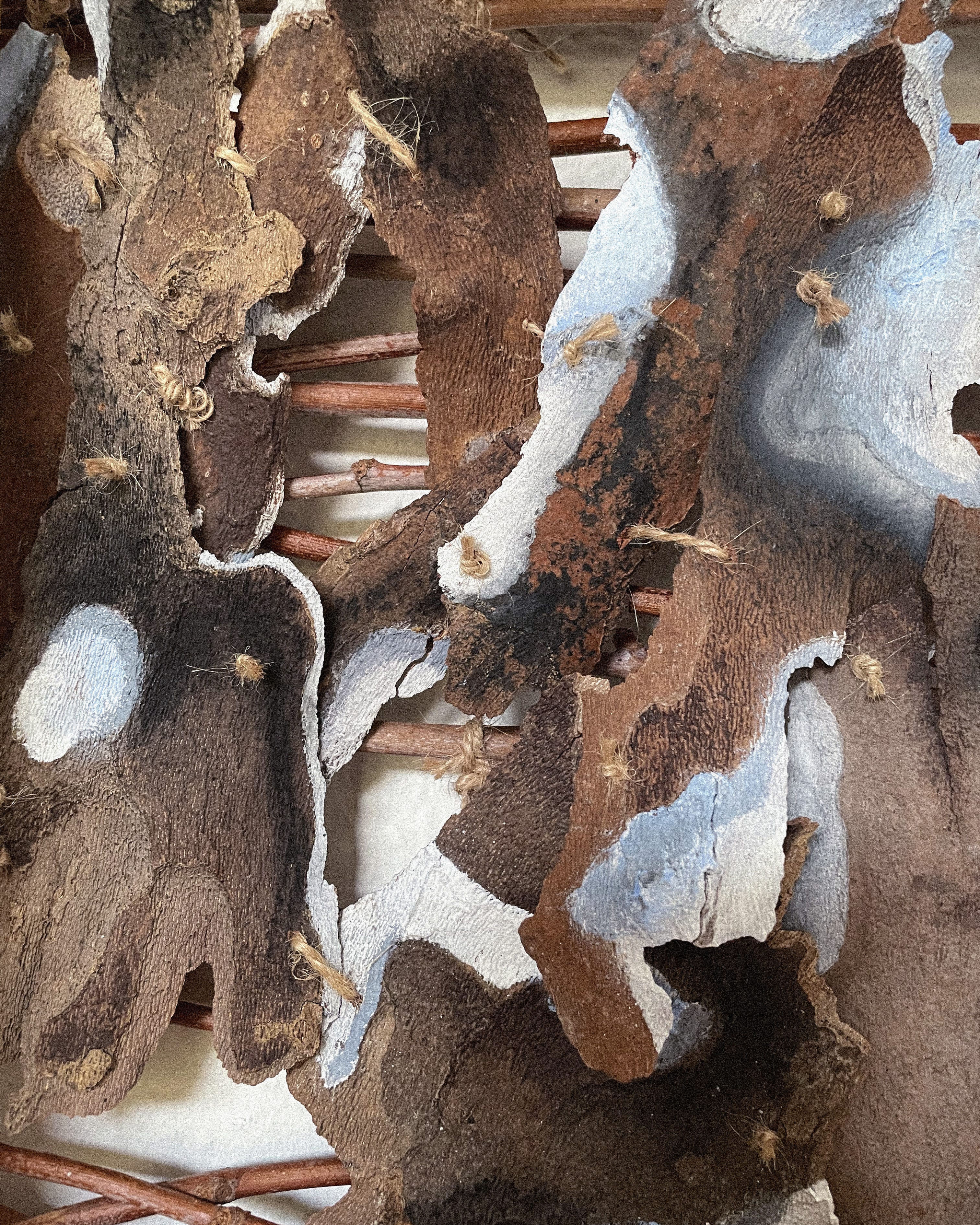 The use of bark, jute, antique nails, and foraged fragments introduces both folk and colonial histories into the work. How do you navigate the tension between the poetic possibilities of these materials and the sociopolitical baggage they carry, particularly when referencing beautification, social status, and palatability?